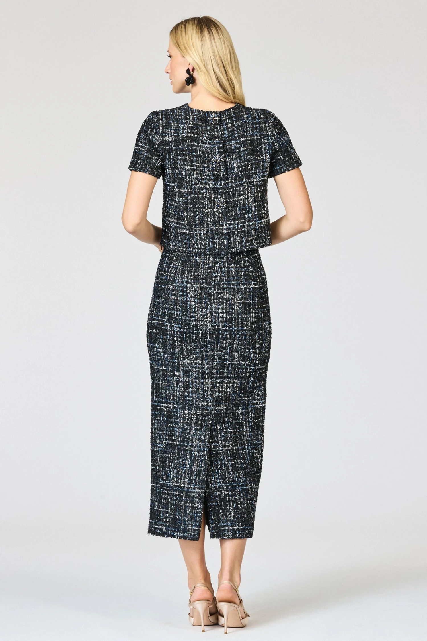 The Adora Skirt is a study in modern elegance. Crafted in our Obsidian Frost tweed, this slim, midi-length silhouette balances structure with ease. A clean waistband and back slit lend wearability, while the textured weave adds dimension and subtle shimmer. Pair it with our Elsa Top for a sleek knit for elevated day-to-night styling.