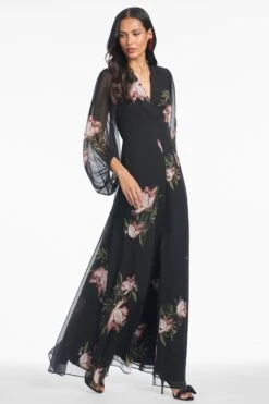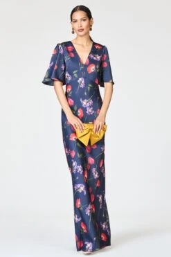 The Brooke is our V-neck gown with box pleats, peaked waist seam, and side pockets. This dress is what we consider to be a classic, essential silhouette, a perfect canvas for our most breathtaking prints.