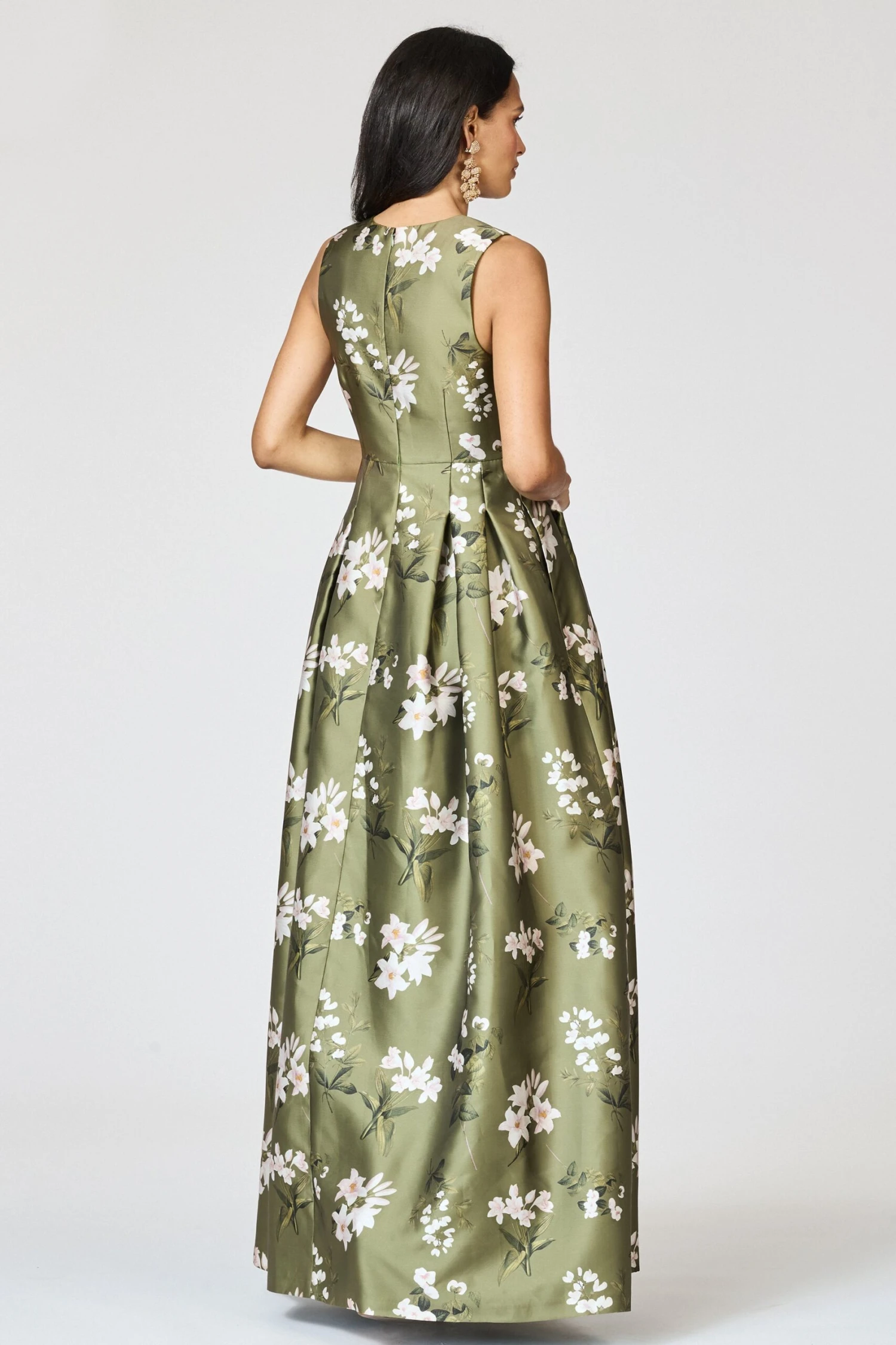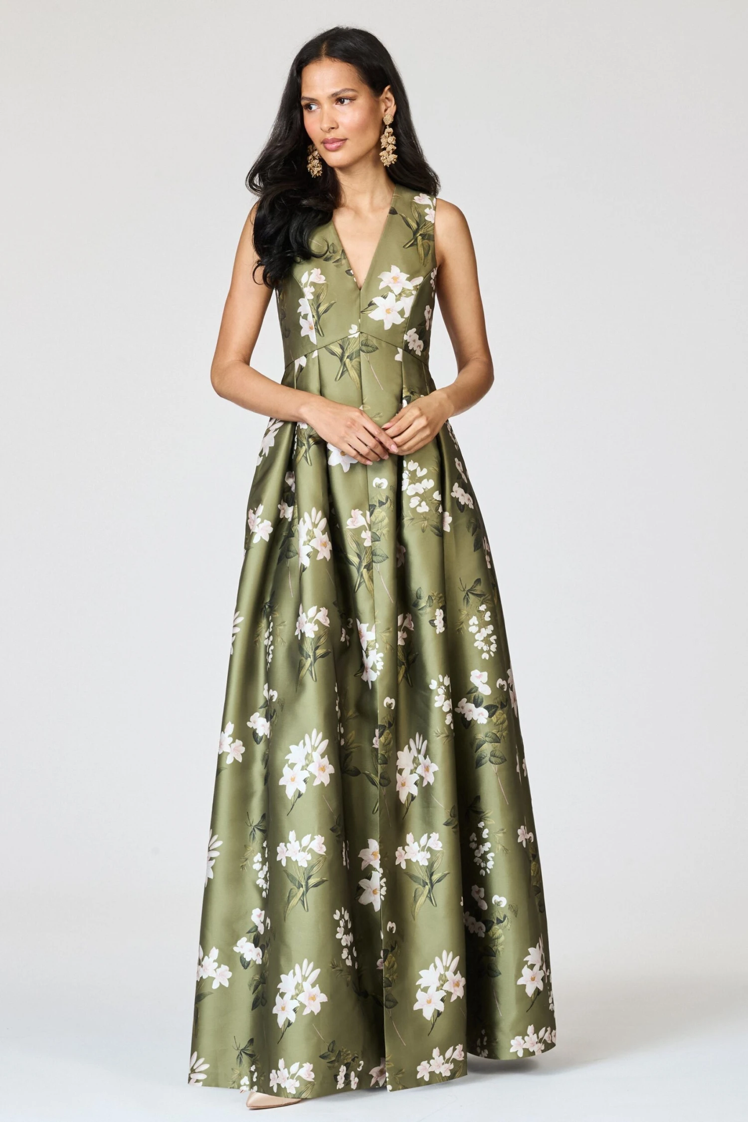 The Brooke is our V-neck gown with box pleats, peaked waist seam, and side pockets. This dress is what we consider to be a classic, essential silhouette – a perfect canvas for our most breathtaking prints.