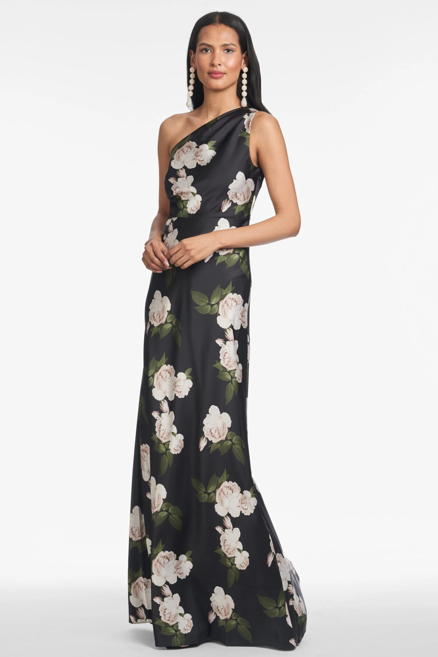 Delphine is our take on the one-shoulder, wear-on-repeat gown. The printed satin crepe cutie, featured in our Obsidian Blooms print, flatters in all the right places. Timeless yet modern, this gown will be on your black tie rotation.