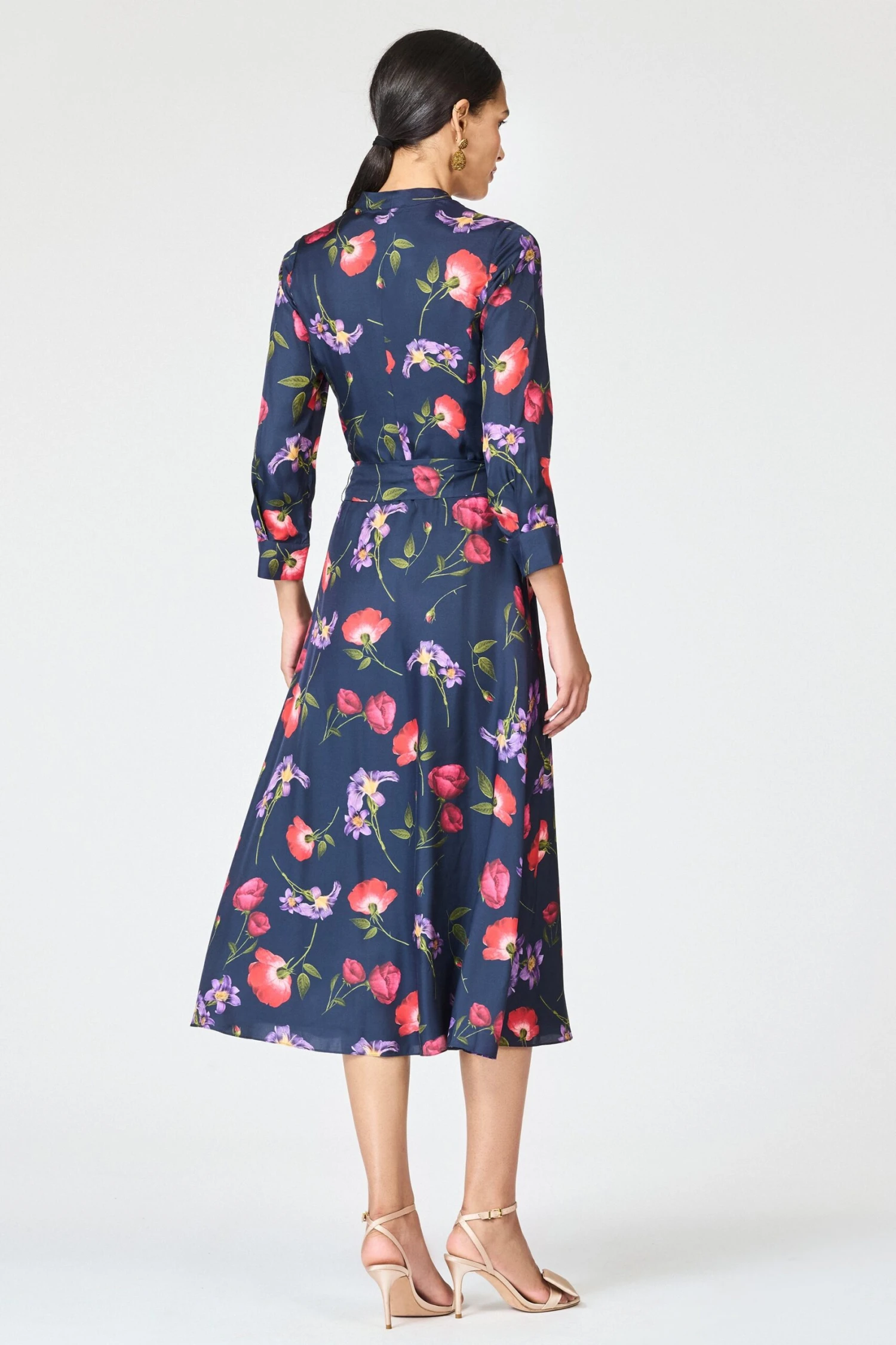 Elizabeth is a tailored, graceful, and playfully vibrant “desk to dinner” dress . Cut in printed silk-viscose twill, the shirt-dress silhouette features a flattering stand collar, summary front, and a soft tie belt to cinch the waist. The Midnight Jardin floral print adds a romantic burst of rich color, making her the perfect pick for everything from garden lunches to gallery evenings.