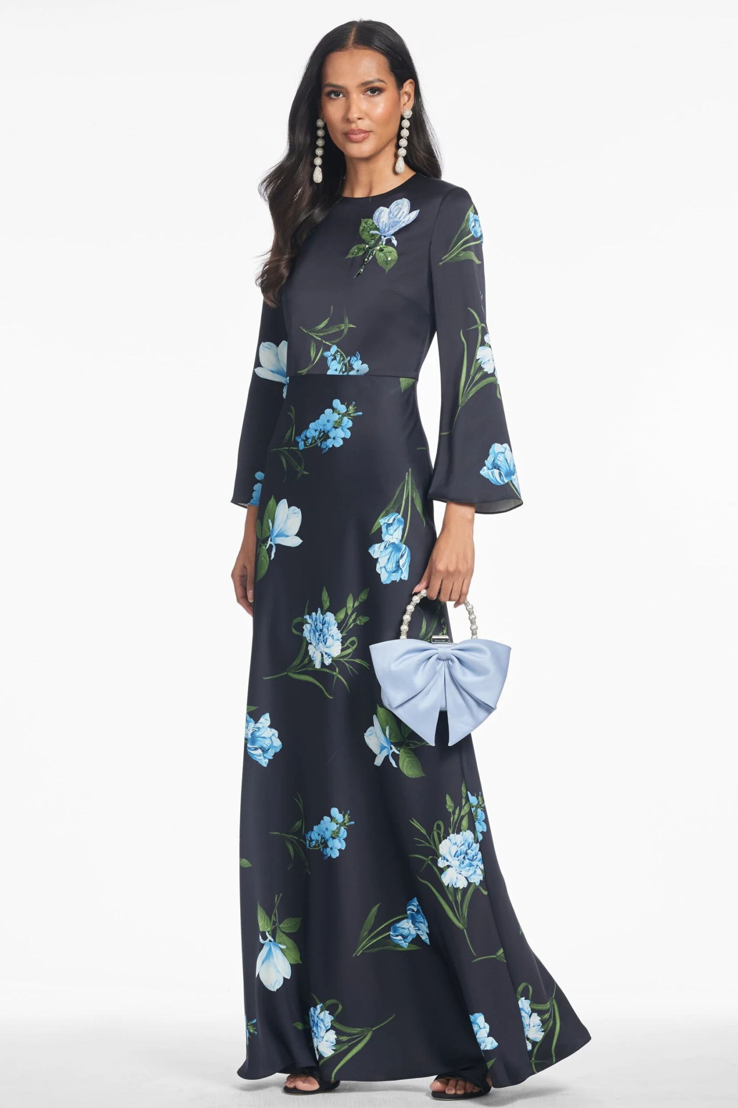 Alex is a gown who knows who she is: elegant, timeless, and chic. This long-sleeve, satin crepe dress is in our Night Sky Blue Oculata print is lit at the bodice with fine iridescent sequins to highlight the featured floral.