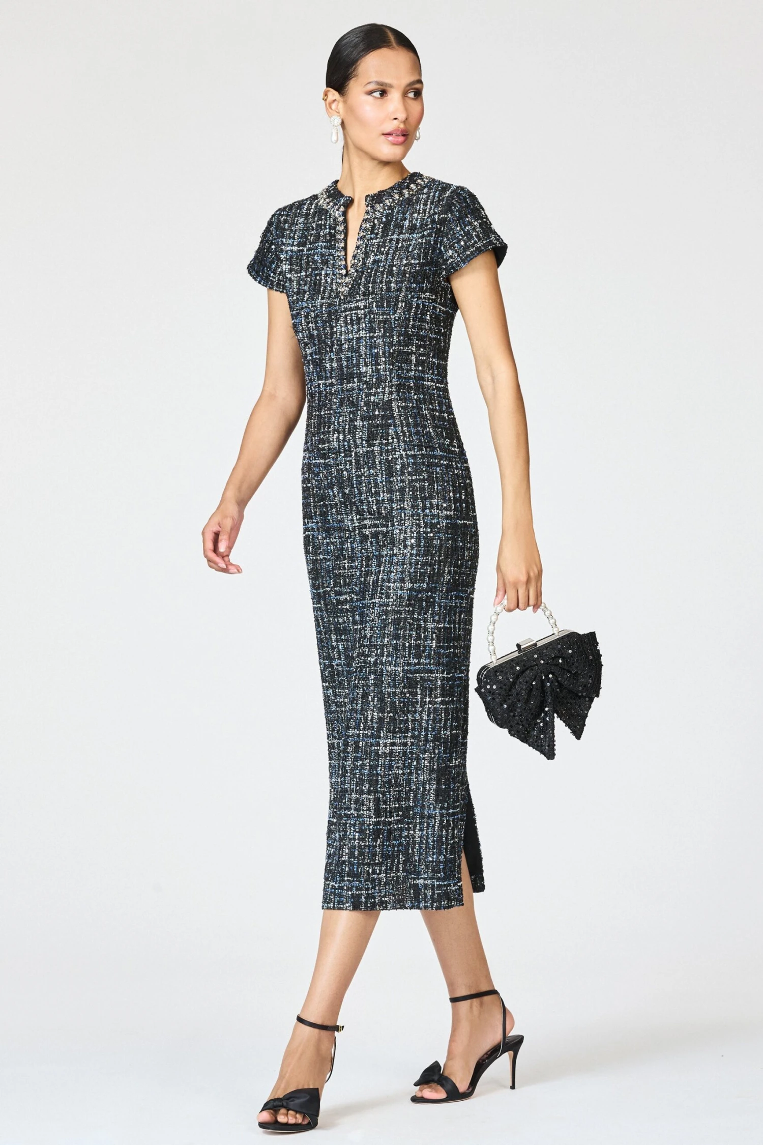 The Liz Dress brings structure and sparkle in equal measure. Crafted in Obsidian Frost tweed, this sleek, tailored silhouette is softly shaped through the body and finished with a subtle slit at the neckline. The collar is gently embellished for a hint of shine—just enough to elevate, never overpower. A polished choice for both daytime occasions and dressed-up evenings.