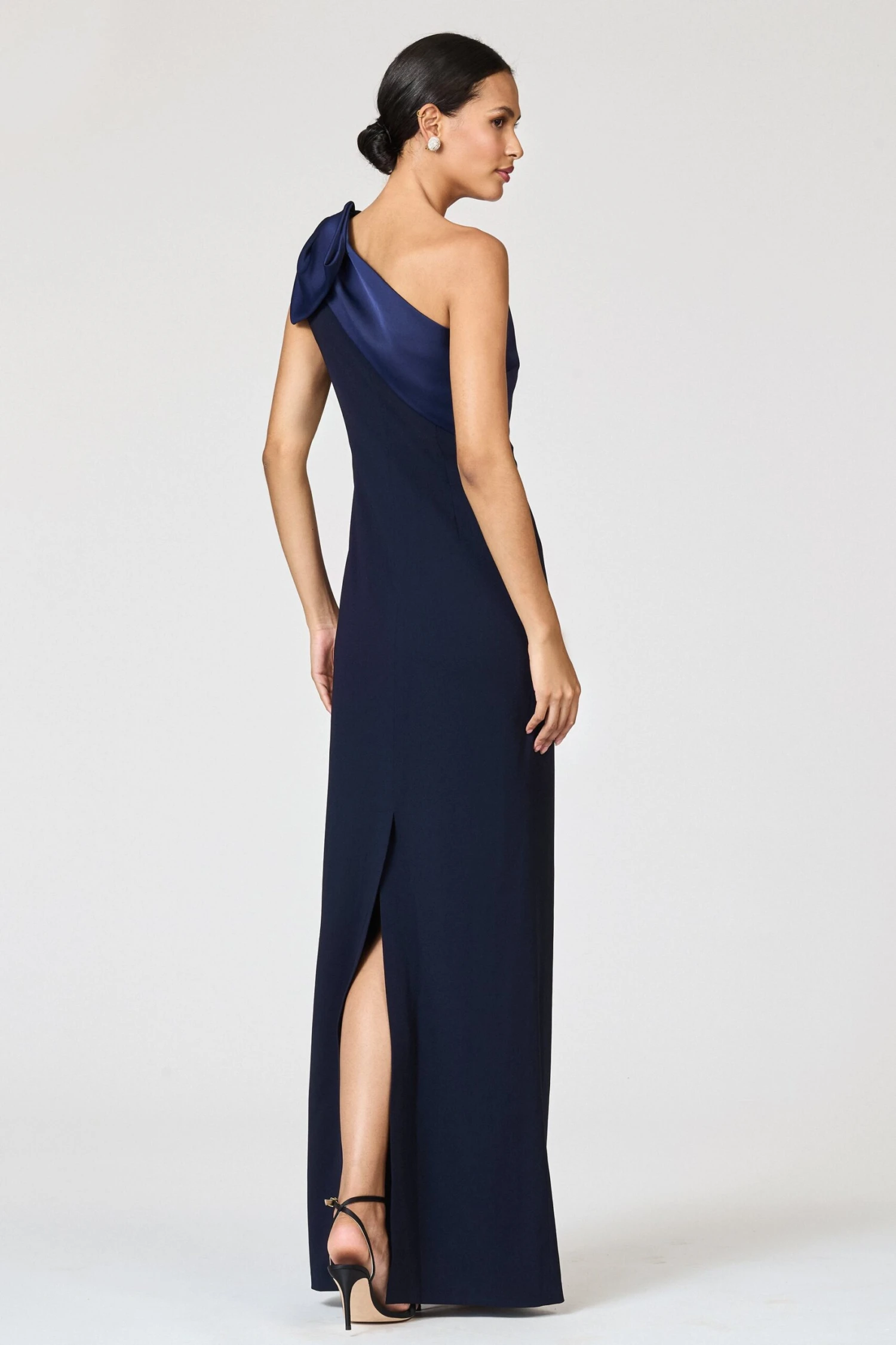 The Estrella Gown in Midnight is a statement of refined evening glamour. Cut from sleek satin crepe in a deep, rich Midnight, it features a modern, sculpted one-shoulder neckline that frames the collarbone beautifully. The column silhouette is clean and elongating, with gentle seaming on either side that accentuates the waist before falling to a graceful floor-length hem. A dramatic oversized bow detail adds a touch of sculptural elegance, making this gown perfect for black-tie events, galas, or any occasion that calls for a show-stopping, sophisticated look.