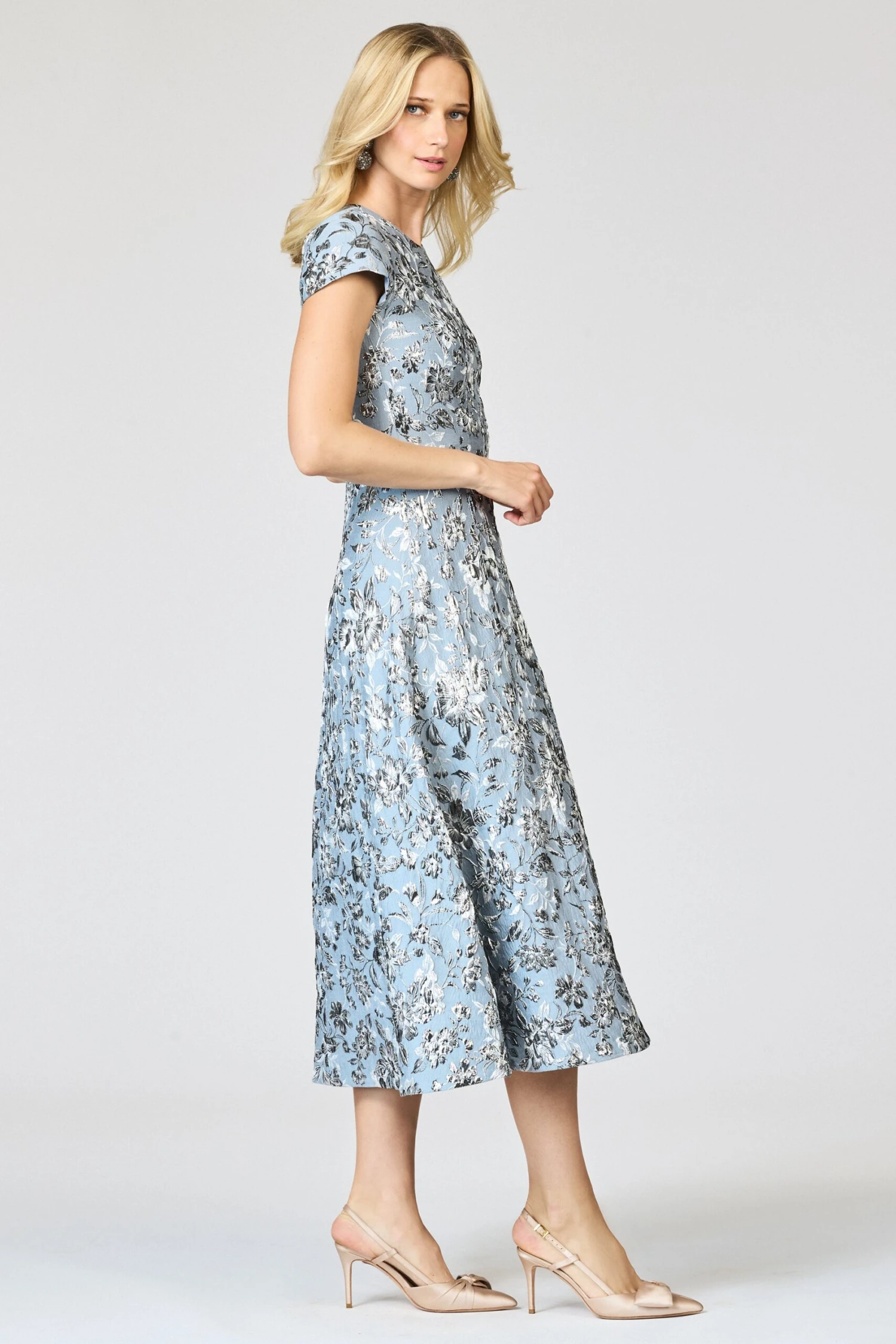Expertly designed, our Jackie dress is a timeless and sophisticated tea-length fit and flare with pockets, featuring pleats at the front for subtle movement. Made from our luxurious metallic cloque fabric, this occasion dress showcases a Pewter Gardens pattern, complete with elegant cap sleeves and a rounded neckline. Suitable for both daytime and evening events, this dress is simply perfect for any occasion.