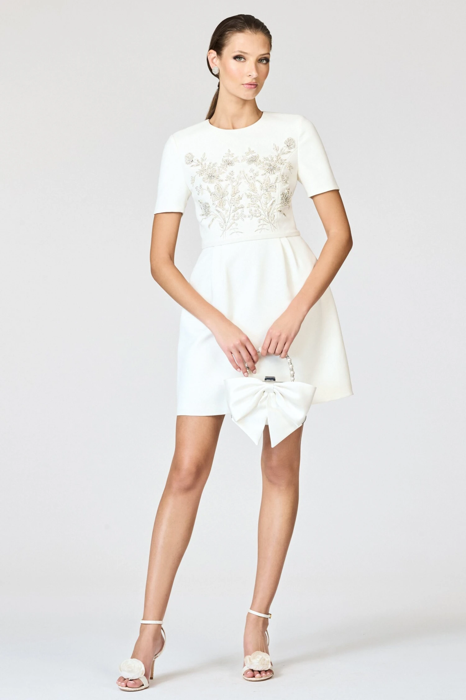 The Luna Dress is a study in modern elegance, featuring a softly tailored silhouette and short sleeves. Intricate beadwork in a botanical motif adorns the bodice, bringing texture and radiance to the refined design. The ivory hue adds timeless appeal, making this piece a polished choice for any special occasion.