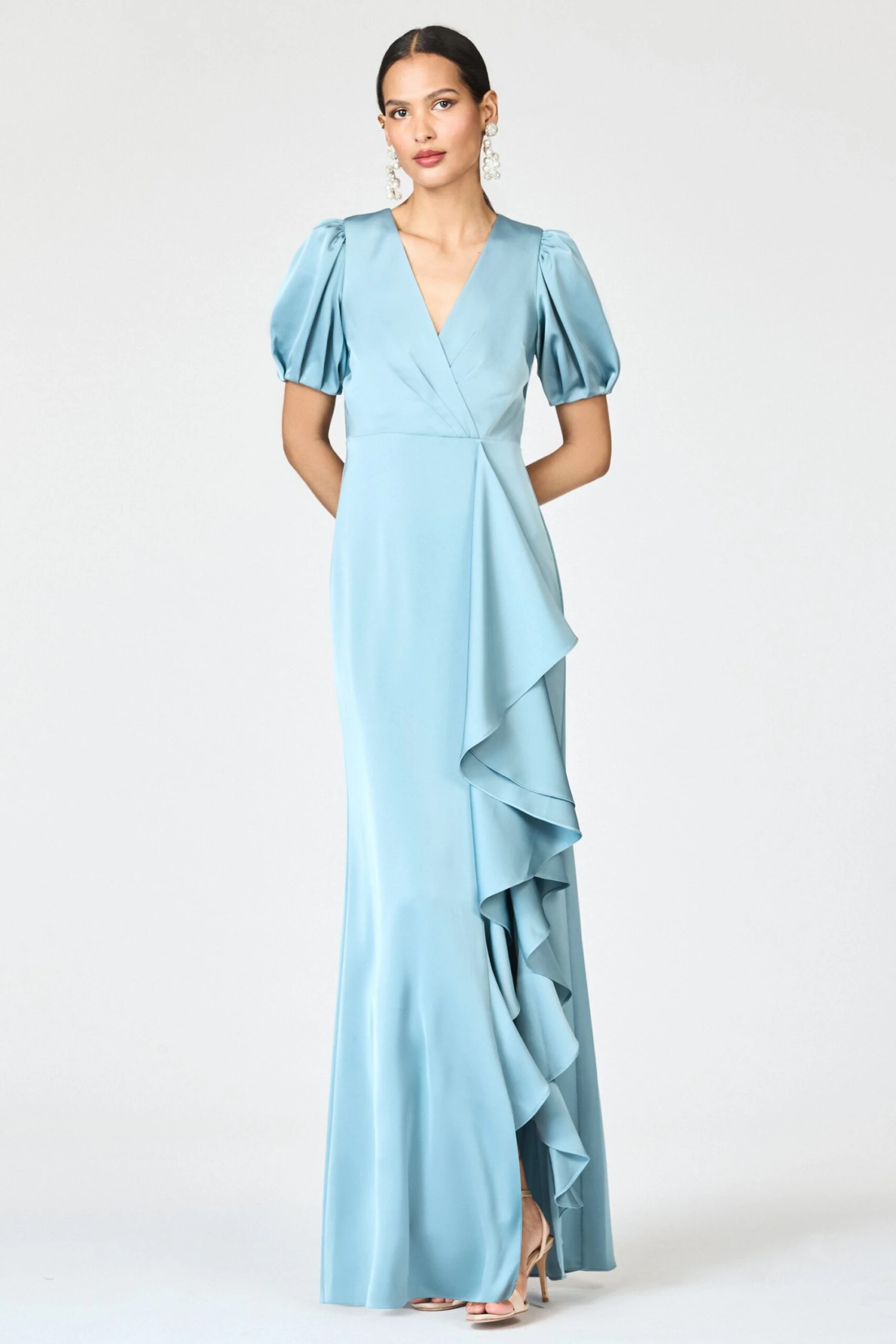 The Mila Gown in Seaglass is a romantic interpretation of modern sophistication. Crafted in fluid satin crepe, it drapes beautifully along the body, offering a lustrous, polished finish. The gathered V-neck bodice and softly structured puff sleeves lend a touch of vintage-inspired charm, while the cascading asymmetrical ruffle adds graceful movement and drama. Elegant yet effortless, Mila is designed for moments that call for refined glamour and timeless allure.