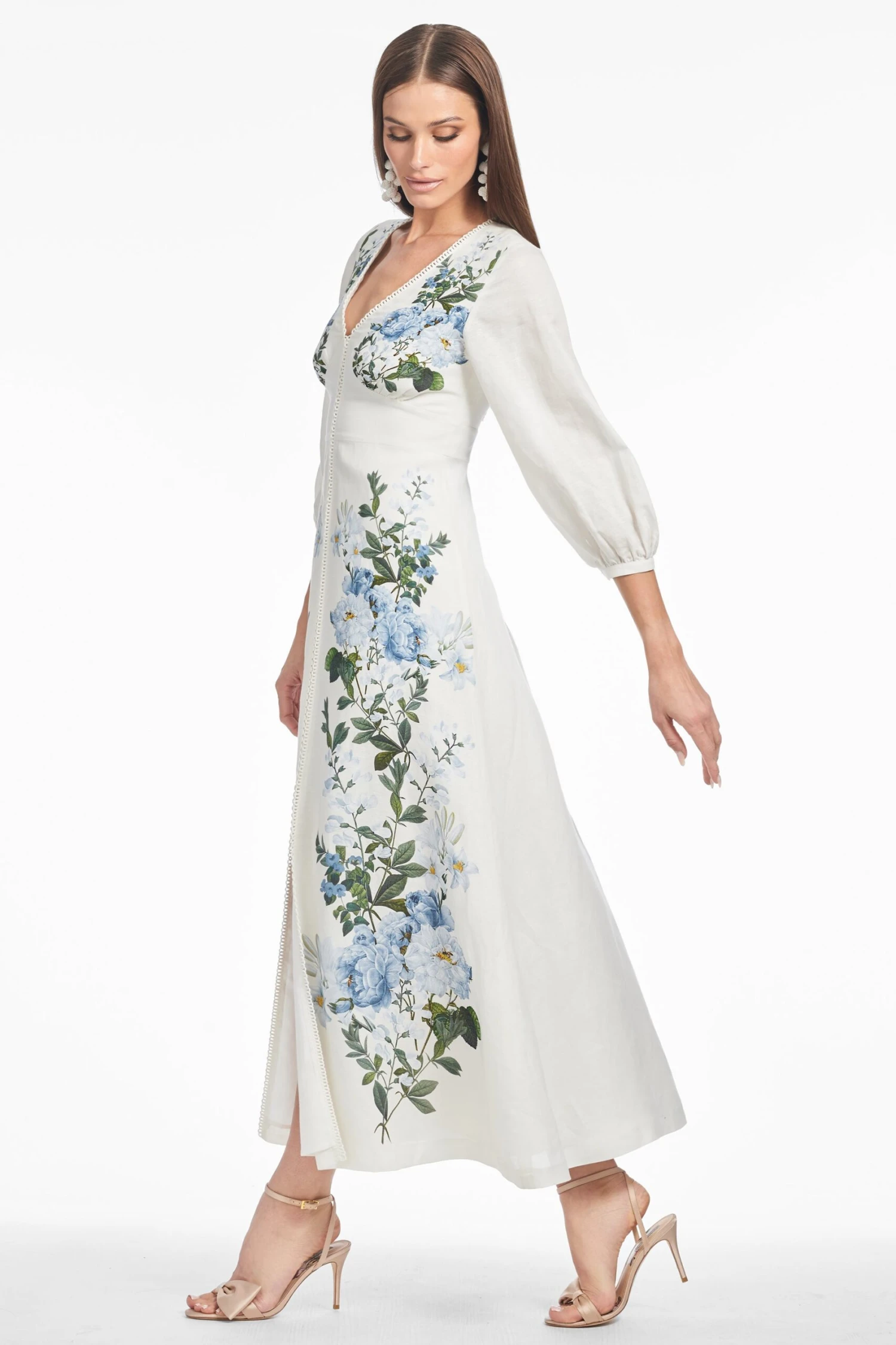 If Spring/Summer sophistication was a dress, she would be the Varenna. Blooming botanicals run symmetrically throughout the bodice, while the sweetest lace embellishment runs through the V-neckline down the center. She’s part linen, part viscose, and the most wearable, special sundress.Â