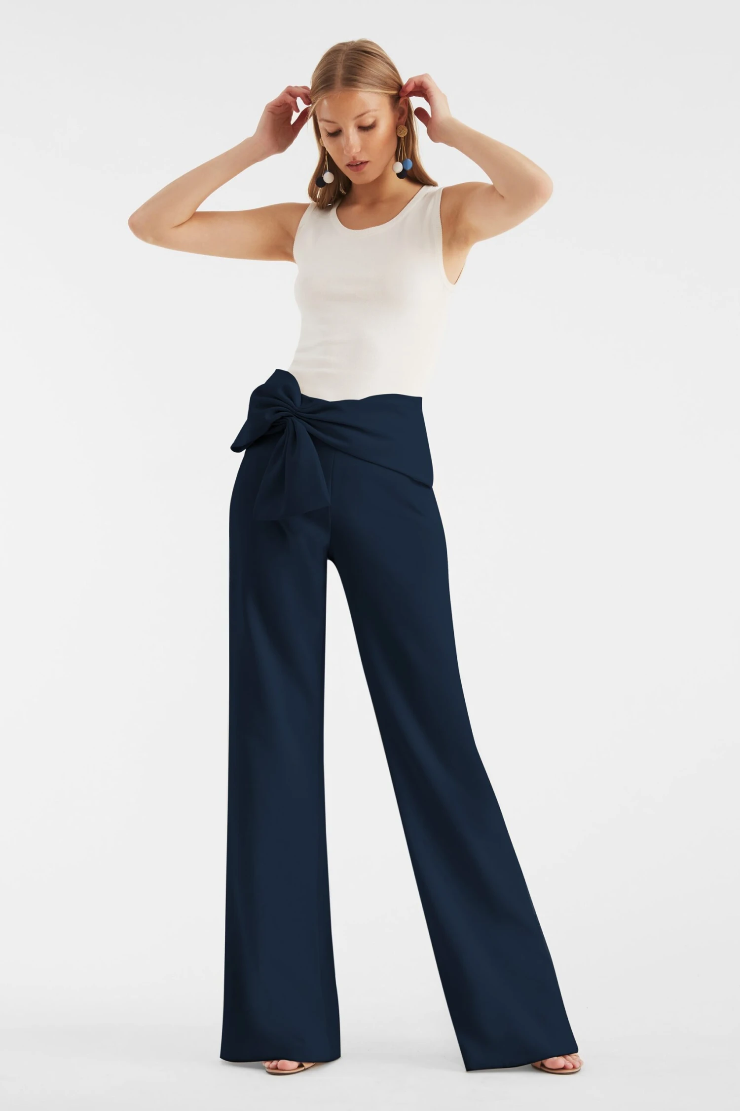 The Whitley pant is featured in our luxe lightweight, stretch crepe, and it is the ideal occasion pant for any season. The magnificent drape of the crepe creates a dramatic effect when paired with the wide-legged silhouette. At the waist a faux full sash with stitched down belt both flatters and conceals. A side zip closure allows for a clean finish to these spectacular pants.
